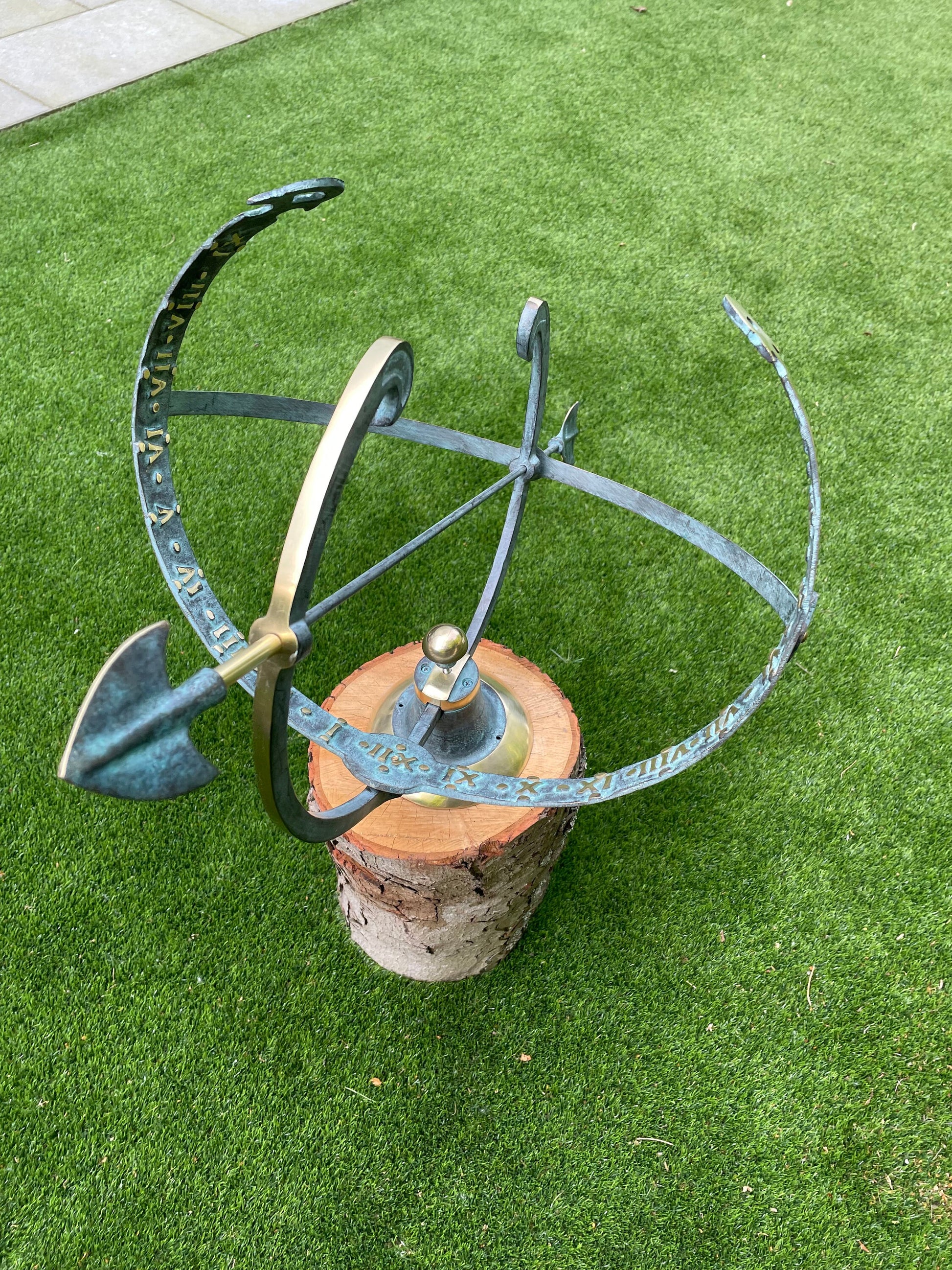 This captivating bronze sundial sculpture elegantly blends science and art in a timeless celestial form. Composed of intersecting rings and a central arrow, it evokes ancient astronomical instruments used to track the movement of the sun. The Roman numerals, arched details, and verdigris-blue patina offer a classical, antique aesthetic, making this piece both a functional and decorative addition to gardens, courtyards, or terraces. A symbol of time, balance, and the cosmos, it brings a refined and intellectual charm to any outdoor setting.