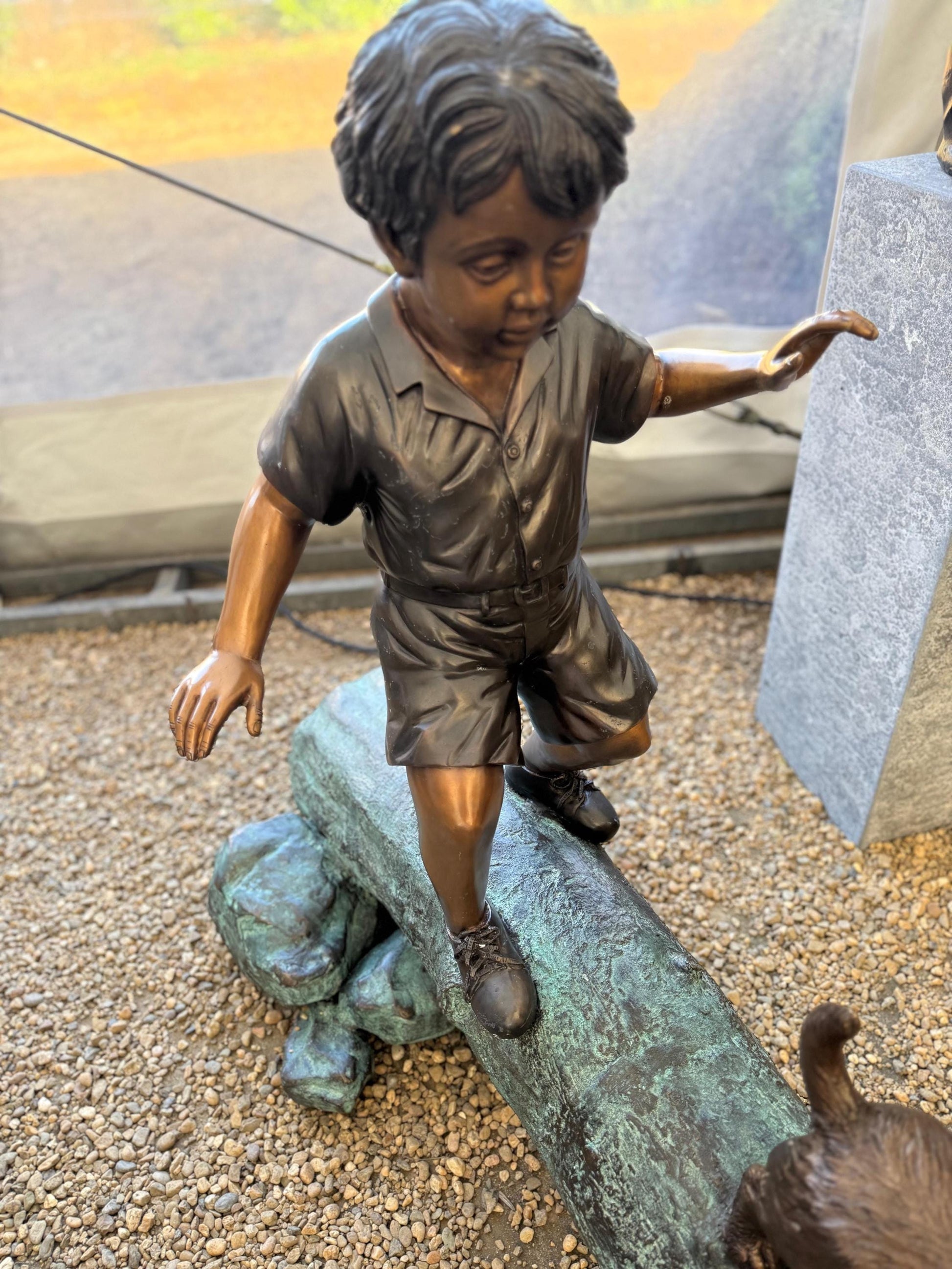 This heartwarming bronze sculpture depicts a young boy carefully balancing on a fallen tree trunk, closely followed by his loyal dog. The dynamic composition captures a moment of playful adventure and pure companionship. With lifelike detail and expressive posture, the piece evokes childhood freedom and the unspoken bond between a child and his pet, making it a beautiful centerpiece for gardens, parks, or outdoor spaces.