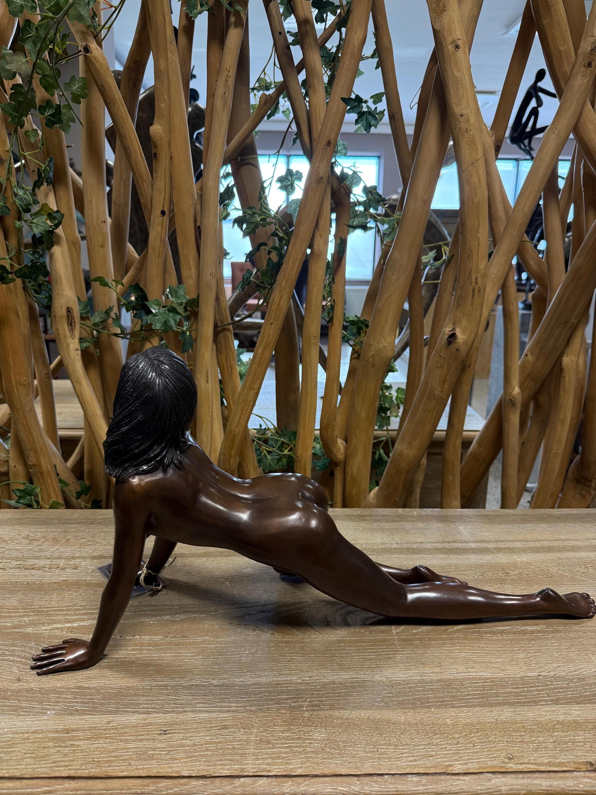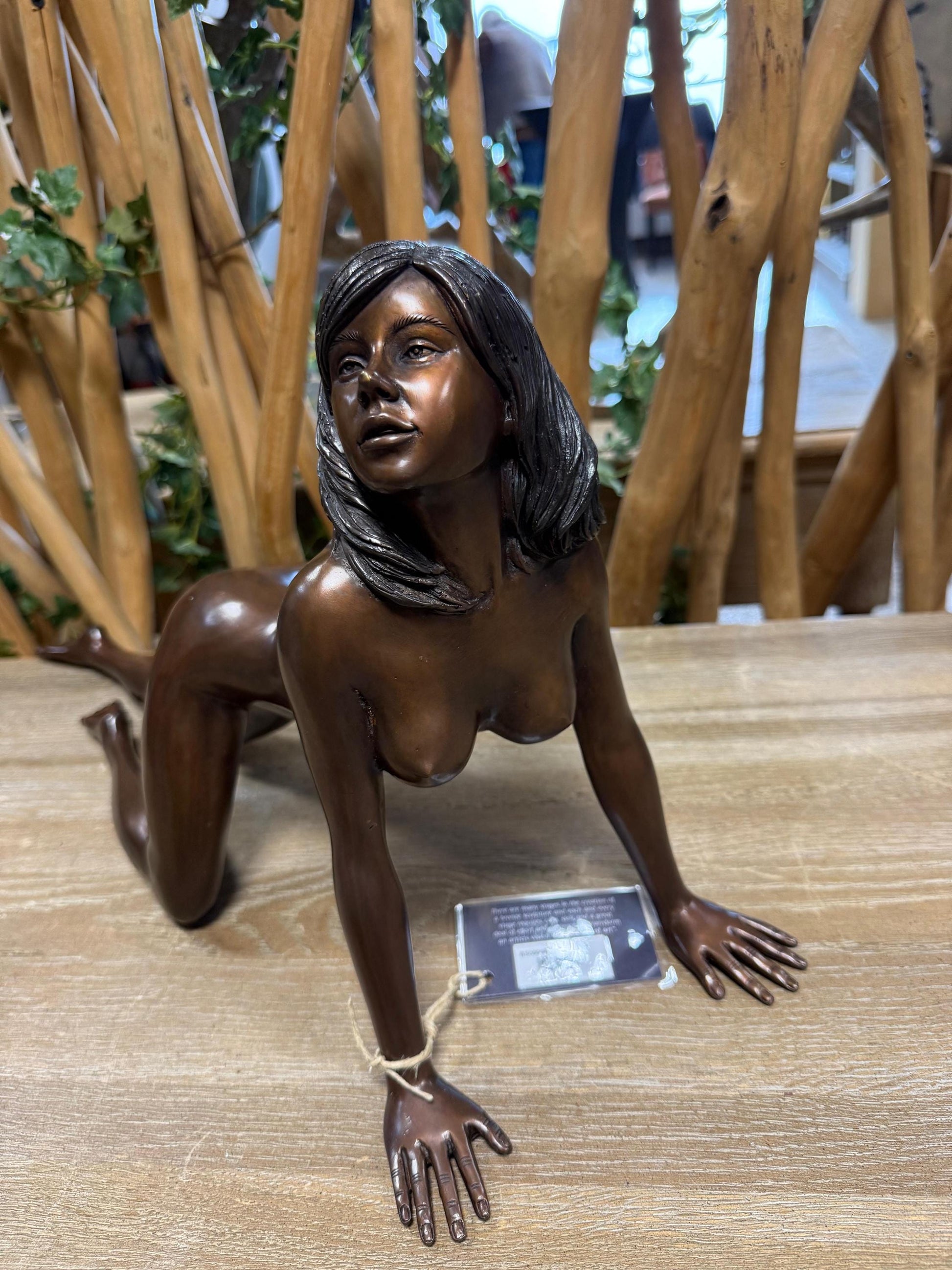 This striking bronze sculpture portrays a nude woman in a bold crawling pose, with her head lifted and eyes gazing forward in confident expression. The smooth contours, finely sculpted facial features, and flowing hair highlight both sensuality and strength. It is a captivating piece that invites admiration for the elegance and natural beauty of the human form.
