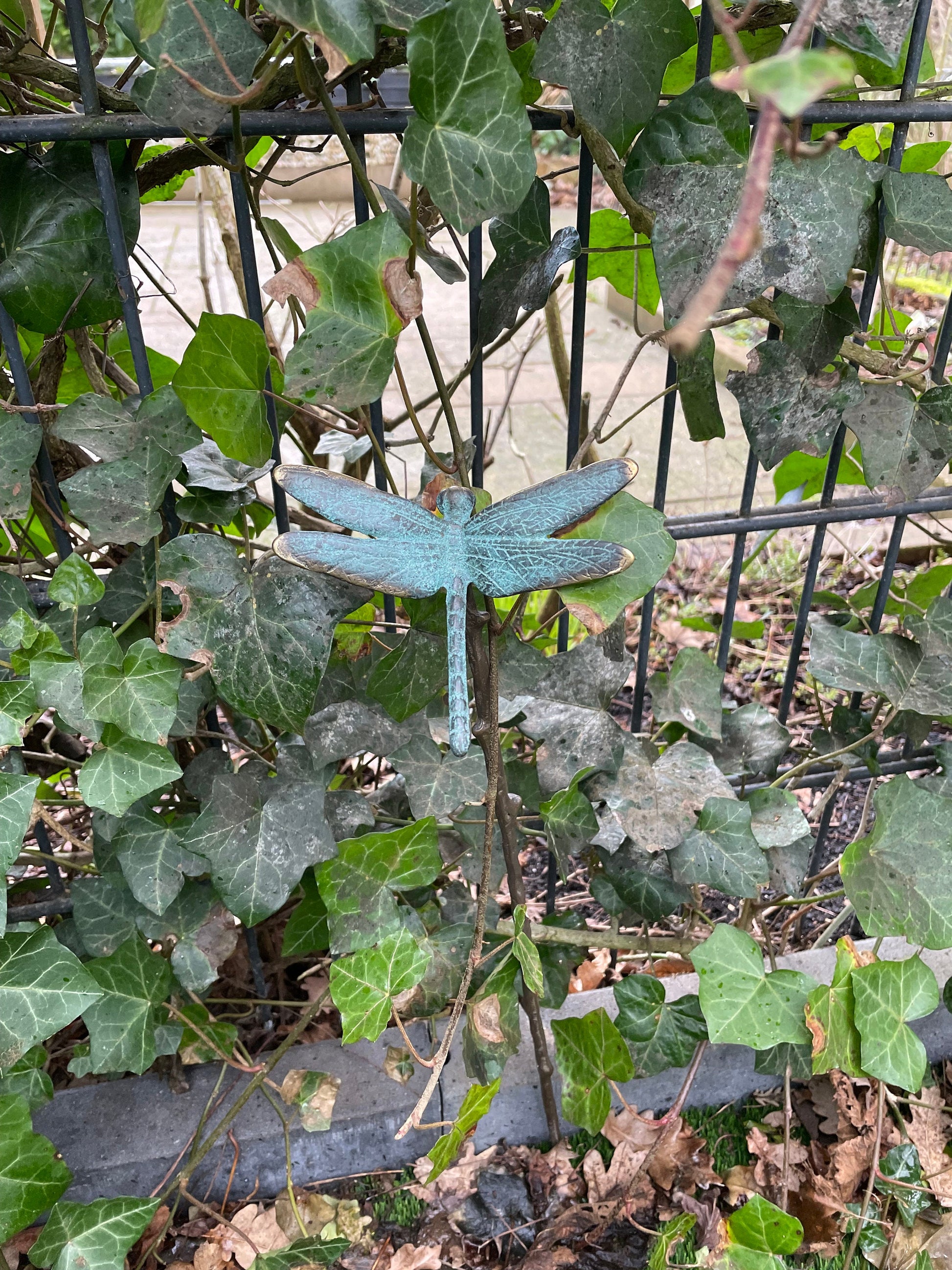 Design: Dragonfly figure mounted on a vertical bronze stake.