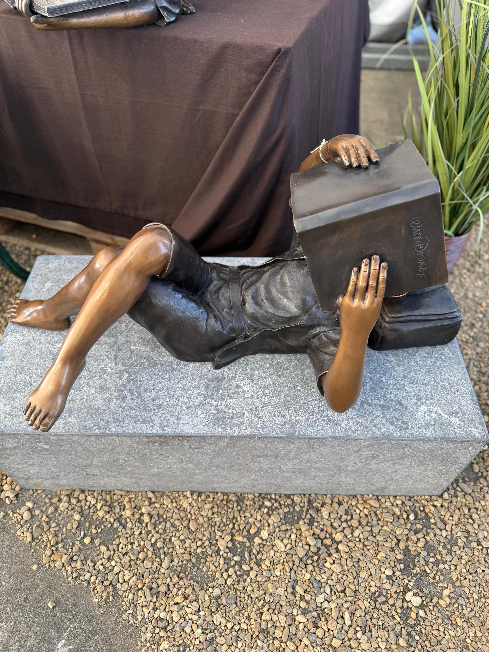 This joyful bronze sculpture portrays a girl lying on her back with a bright smile, holding a book above her head as if immersed in a moment of playful discovery or imagination. Her relaxed pose and expressive face capture the carefree spirit of youth and the wonder of reading. A delightful piece that brings charm, movement, and storytelling to any outdoor space.