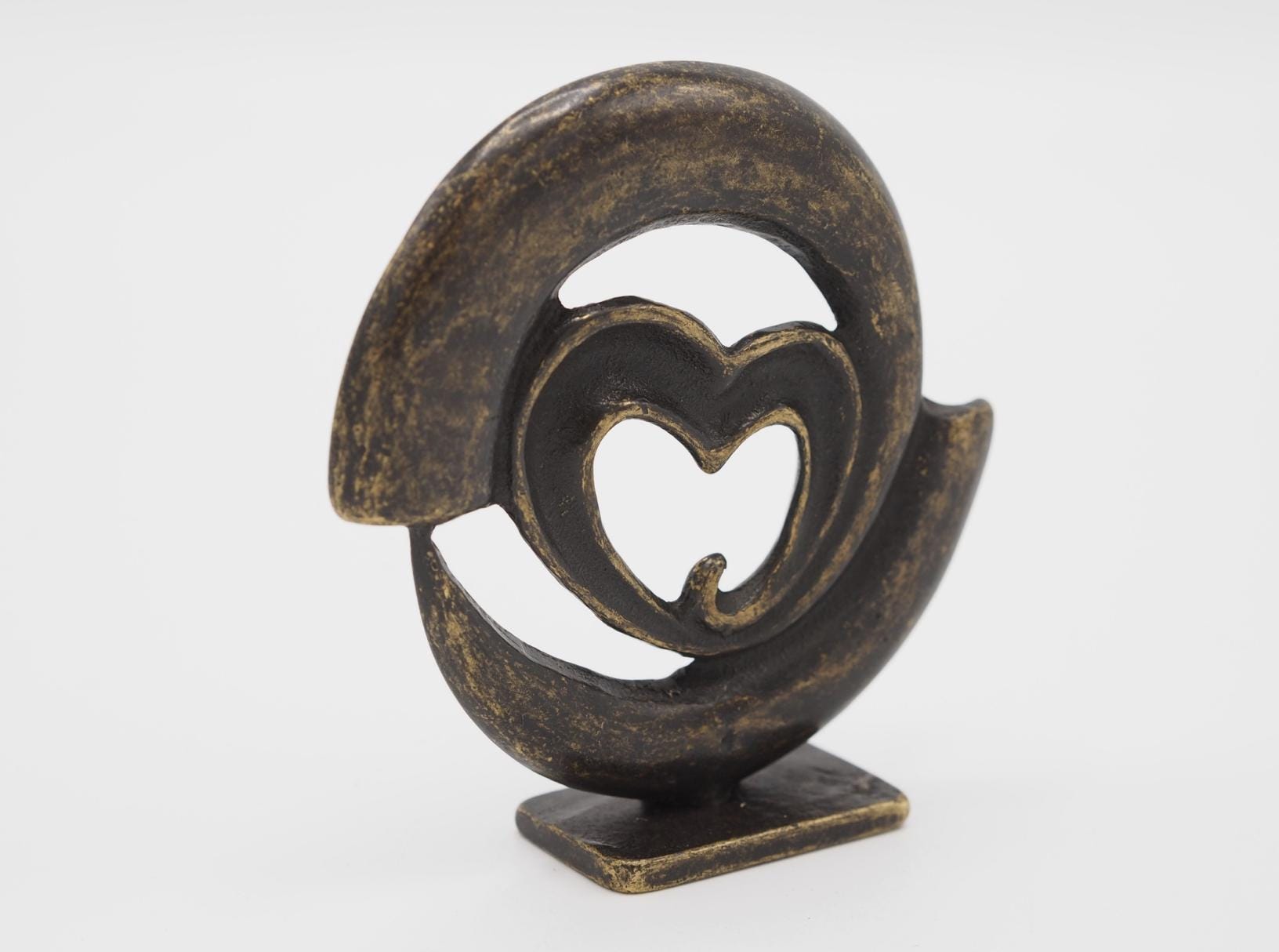 This compact bronze sculpture presents an abstract circular form enclosing a stylized heart at its center, symbolizing unity, emotion, and the protective power of love. With a rustic antique finish and minimalist lines, the piece invites interpretation and adds a meaningful artistic touch to any setting. Ideal as a symbolic gift or for decorating intimate indoor spaces, this sculpture blends simplicity with deep emotional resonance.