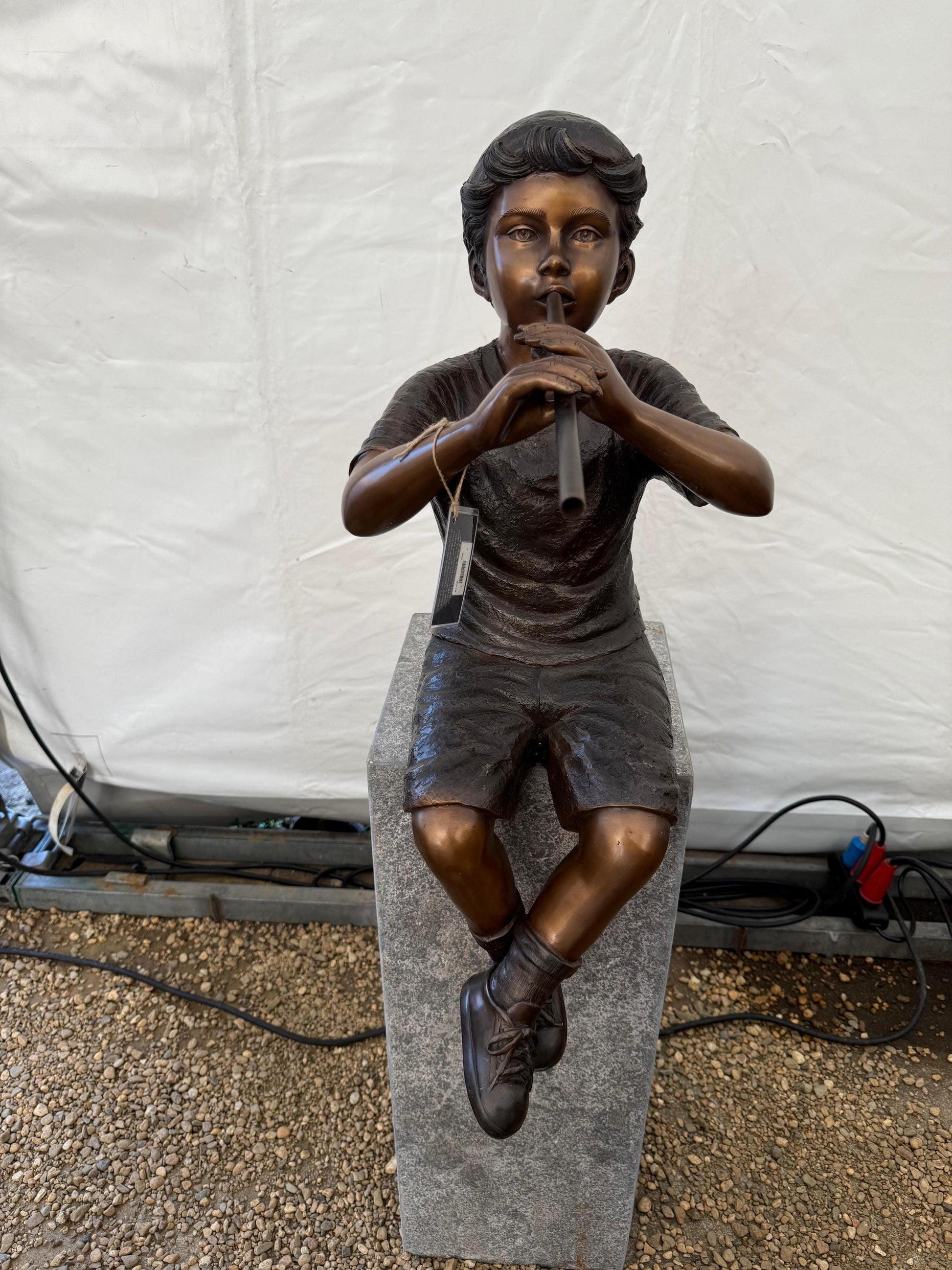 This captivating bronze sculpture portrays a young boy seated on the edge of a surface, playing a flute with focused expression and serene posture. His slightly raised arms and relaxed legs convey a natural sense of ease and innocence, while the detailed texture of his clothing and lifelike features bring warmth and realism to the piece. It is a poetic tribute to the beauty of music and childhood.