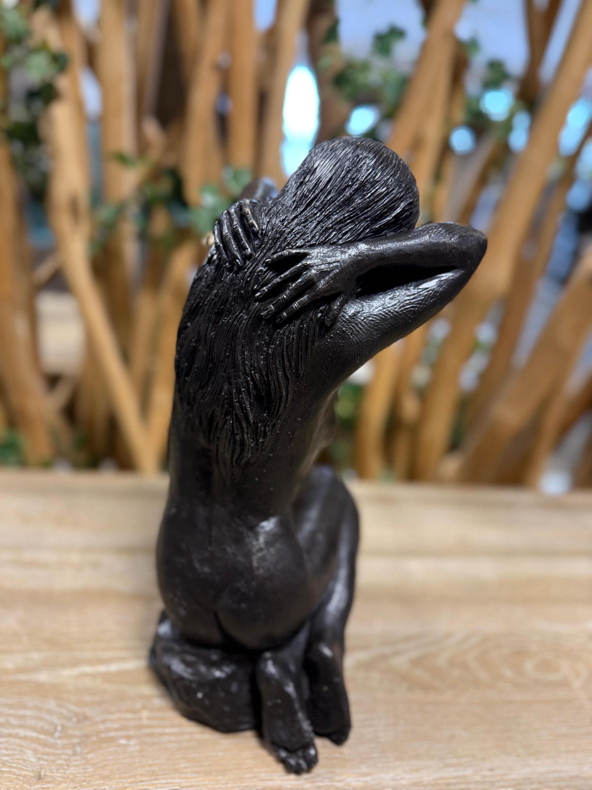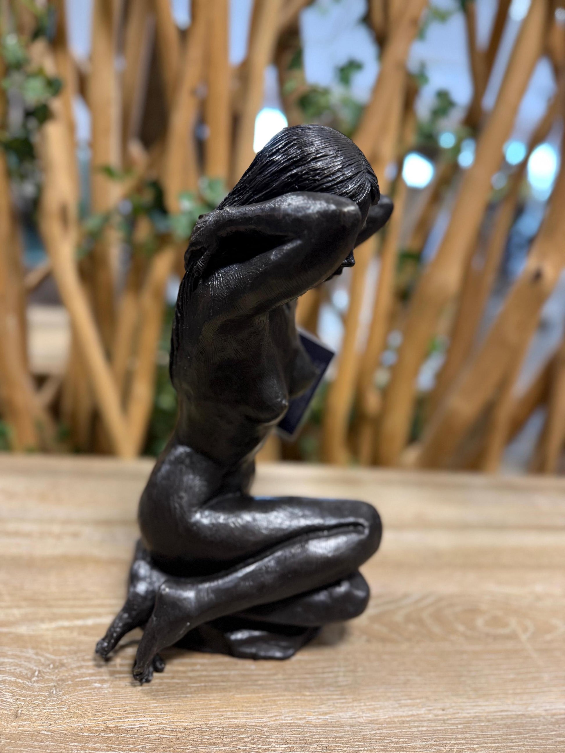 This intimate bronze sculpture captures a contemplative nude woman seated with her legs crossed and arms gently raised behind her head. Her downward gaze and soft posture express a sense of serenity, vulnerability, and self-awareness. Every curve is sculpted with care, creating a timeless representation of feminine beauty and introspection. Perfect for elegant interiors or as a centerpiece in private art collections.