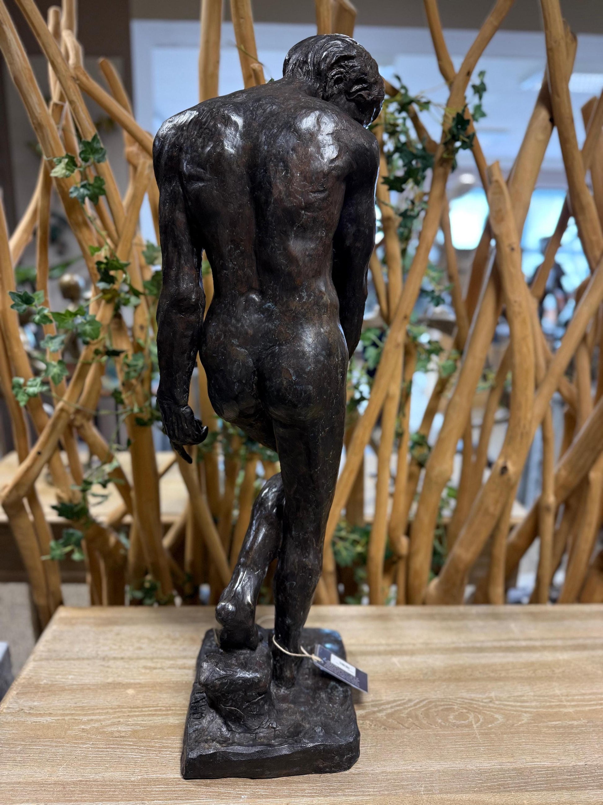 This powerful bronze sculpture portrays a nude male figure in a deeply introspective stance, with head bowed and limbs relaxed in quiet tension. The anatomical detailing and expressive posture reveal vulnerability, thoughtfulness, and emotional weight. Capturing both physical strength and inner reflection, this artwork is a tribute to the complexity of the human spirit. A striking piece for those who appreciate expressive realism and timeless form.
